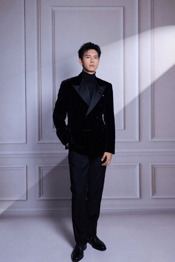 丝绒本身是哑光雾面肌理,自带 “低调高级” 的底色,要是配油光底妆或浓妆,直接就把丝绒的质感冲没了。李现的妆面刚好踩准:清透哑光的底妆只做 “均匀肤色” 的基础功,没加多余的高光;眉形是利落的自然平眉,没有夸张的挑眉弧度;修容也只轻扫下颌线,强化轮廓却不抢镜 —— 让丝绒的柔润光泽当 “视觉主角”,妆面只做 “气质辅助”,这才是 “面料替造型说话” 的正确打开方式。